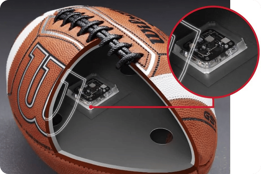 That’s because this “smart football” has a small quarter-sized sensor built into the middle of the ball, which allows it to maintain the same size and weight as a standard NFL ball.